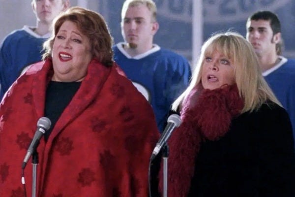Catherine: So true about Luke and Jess, Jackie. One of my other favorite duos is Miss Patty and Babette. Not only are they best friend goals, but they epitomize the power of shame-free living in your 50s, 60s, and beyond. Because, really, people don’t talk enough about the benefits of aging. It might come with more random aches and pains, but Jackie and I have both experienced the beauty (and power) in giving less effs about what other people think. With every birthday, I care less and less about what other people think of me. Miss Patty and Babette embody that liberation so marvelously. It’s so refreshing for perfectionists and achievers like me, who’ve spent most of our lives trying to succeed and do all things we’re “supposed” to do. If they want to dominate karaoke, they do it. If they want to sing at the hockey game, they do it. If they want to talk about their sex lives, they do it. (Which is something we chatted about in depth in our early episode, “Sexuality of Women of a Certain Age.”)