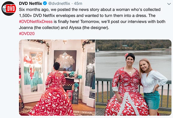 JW: I love it! My love for the history of film and television still keeps me motivated to watch and document all the new Christmas programs each year. It also gives me the opportunity to visit archives and museums to watch forgotten TV programs from the past. I’ve also been lucky enough to be invited to join a panel discussion at the very first Christmas TV movie convention—Christmas Con—in 2019. I’ve appeared on two TV programs talking about Christmas TV specials. In 2018, I was selected by DVD.com/Netflix to be the highlight of their 20th anniversary, when I made a dress, resembling Rosemary Clooney’s dress in the 1954 movie White Christmas, made from the red paper envelopes used to ship DVDs by the subscription service DVD.com. The photos of the dress went viral and I ended up on Pee-Wee Herman’s website!